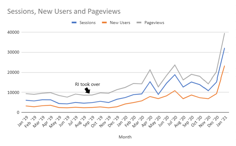 Sessions: When I started in September of 2019, the website had roughly 5k a month. By January of 2021, it increased by 540%